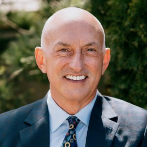 Headshot of smiling man with dark blue suit and yellow, light blue, and purple patterned tie. Greenery in the background