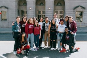 Group of MSM outside of the main entrance wearing MSM Campus Store Clothing