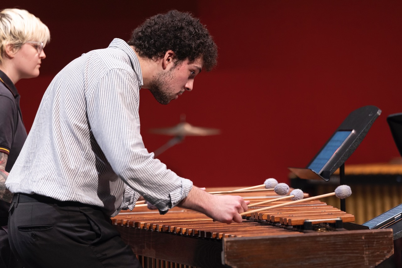 Mihail Babus (MM ’27) is an up-and-coming percussionist who has performed across the United States. He has been instructed by numerous professional artists such as Joseph Gramley, Kevin Bobo, Joseph Galvin, Andy Miller, John Tafoya, Matt Ward, David Cossin, and John Ferrari. Alongside a classical training he has also studied Afro-Colombian, Afro-Cuban, and Afro-Brazilian folkloric music and percussion. From orchestra to student work premiers, Mihail is committed to realizing all manners of projects. Such projects led him to work with artists Greg Beyer, Andy Akiho, and Ted Atkatz in venues such as the Colburn School and the Percussive Arts Society International Convention in Indianapolis. Mihail graduated from the Indiana University Jacobs School of Music with a Bachelor of Music in percussion performance and is currently studying for his master’s degree in contemporary percussion performance at Manhattan School of Music under the tutelage of David Cossin and John Ferrari.
